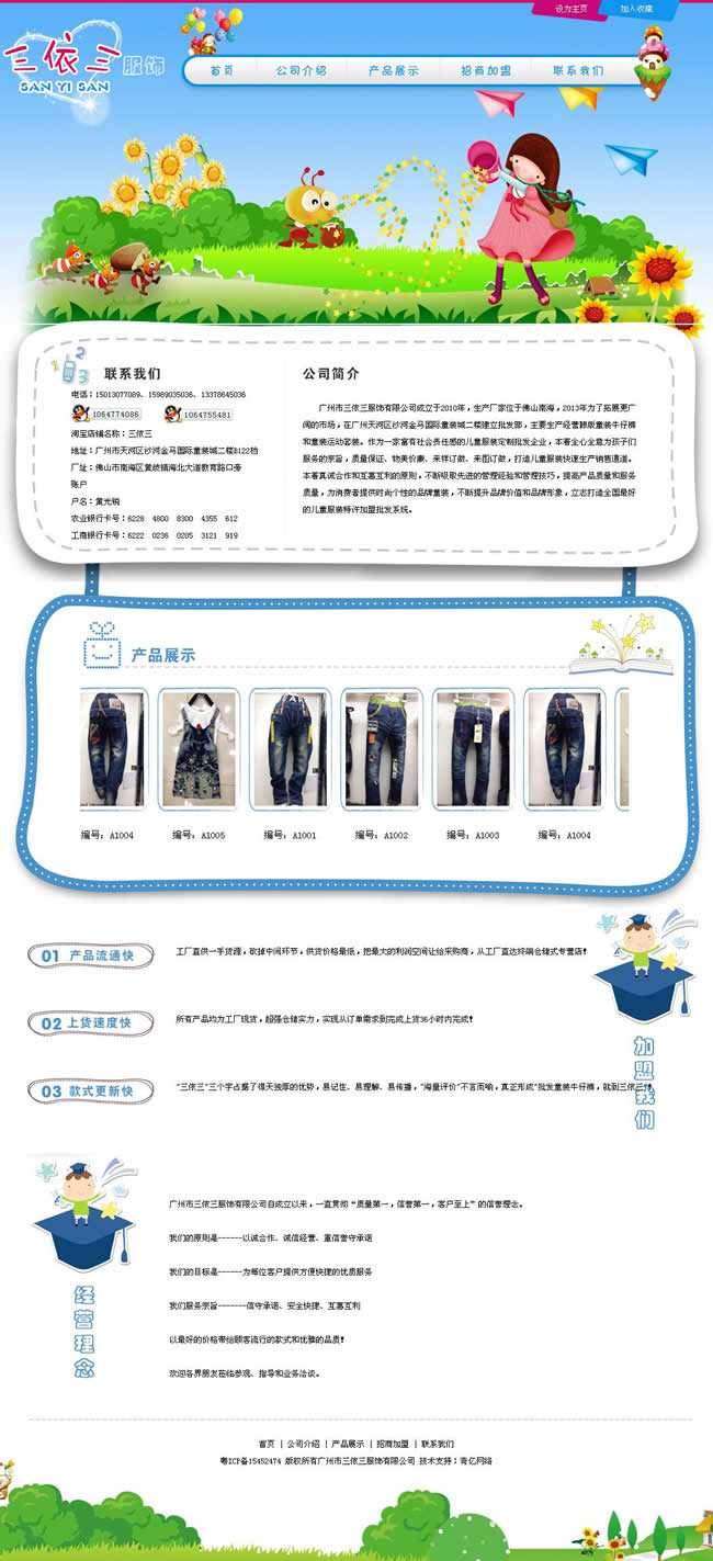 三依三服飾公司是一家專業(yè)設(shè)計與經(jīng)營各種童裝的服飾公司,面向批發(fā)與零售團(tuán)體,因而網(wǎng)站設(shè)計以充滿童趣的設(shè)計手法以及明快的色調(diào)搭配為主,而為了更好的向客戶展示自己的特色,網(wǎng)站特地設(shè)計成簡潔的營銷頁模式,以方便三依三服飾公司進(jìn)行后期的網(wǎng)絡(luò)營銷工作。
